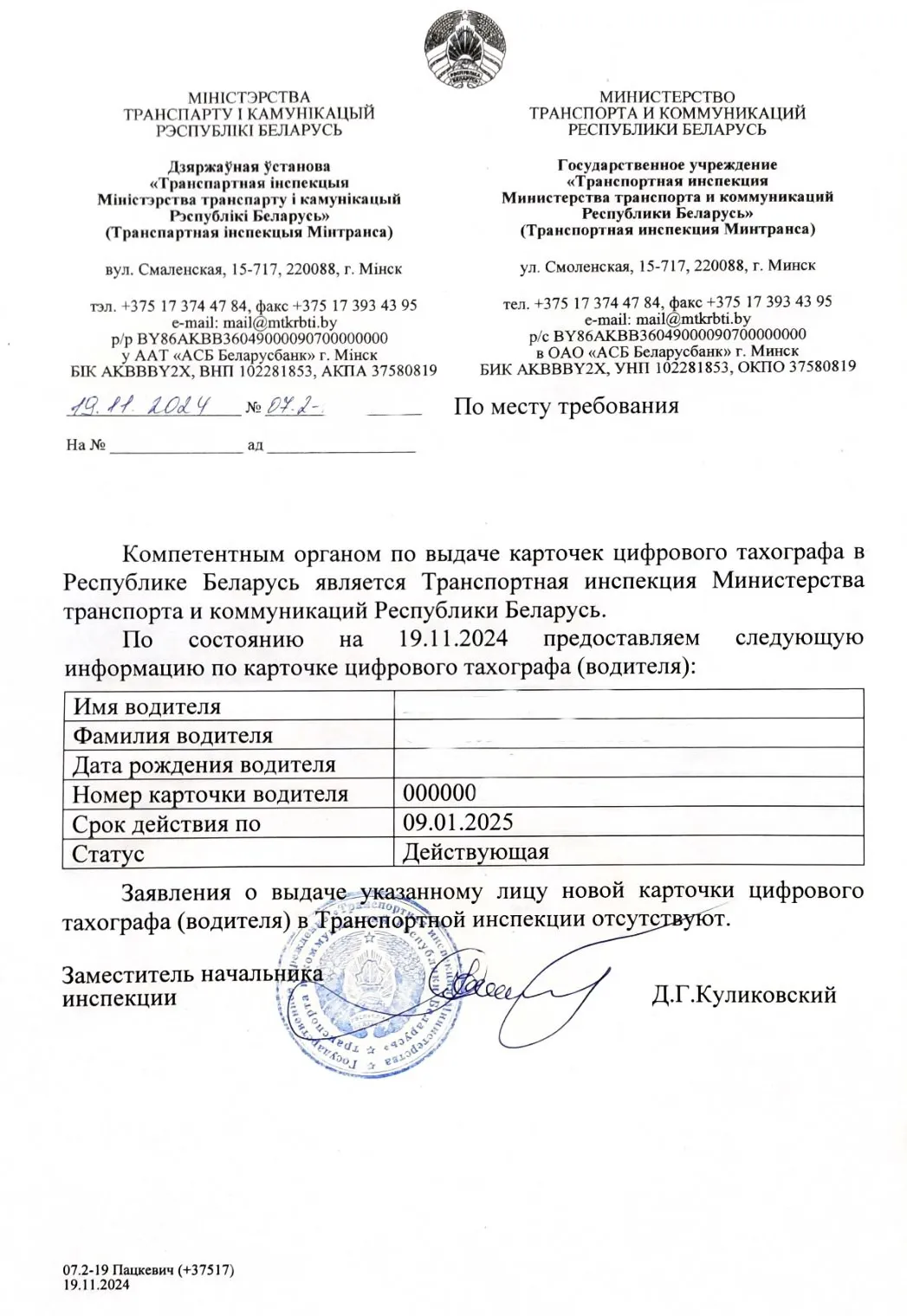 Цена на апостиль справки из Транспортной инспекции Министерства транспорта и коммуникаций РБ